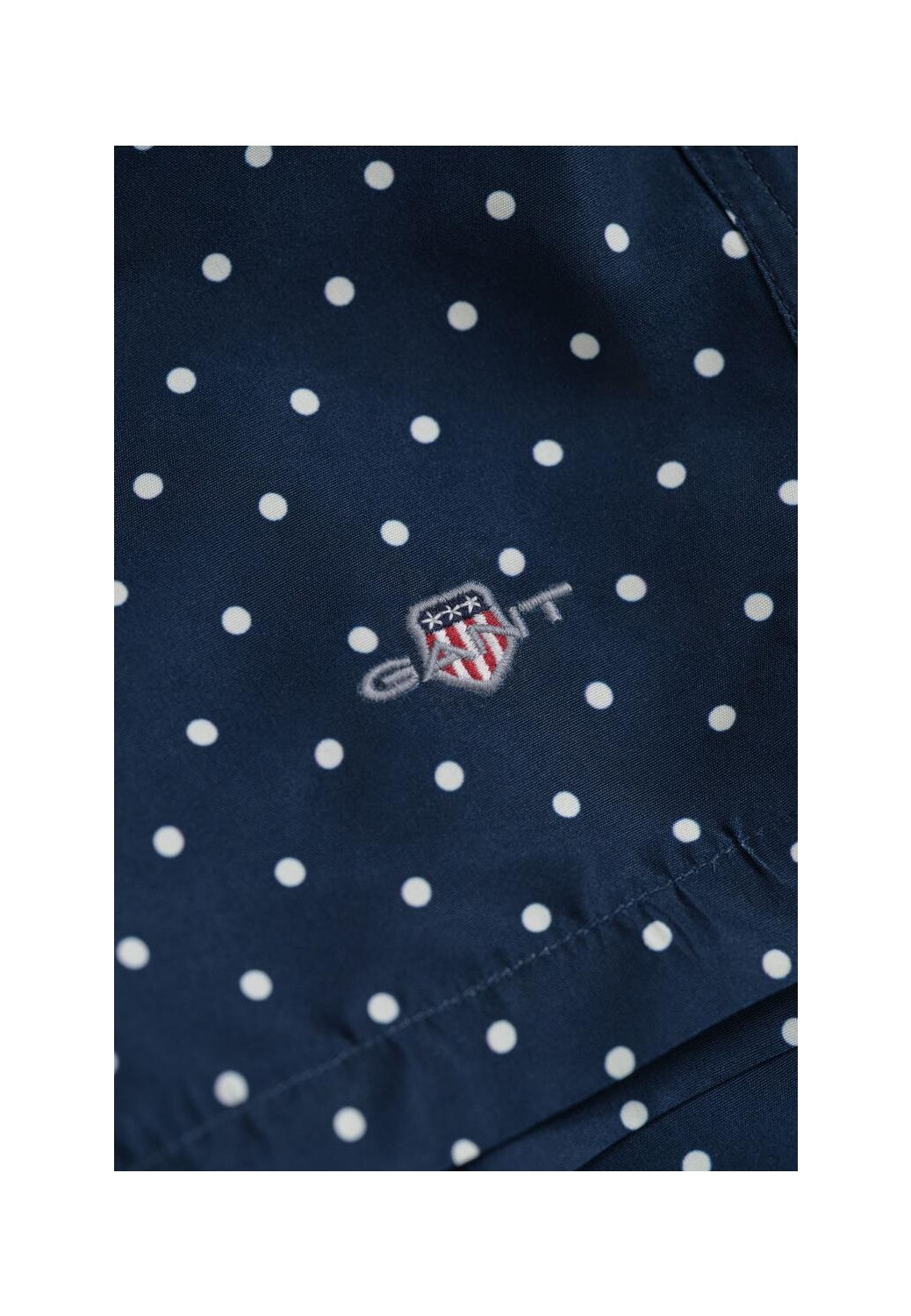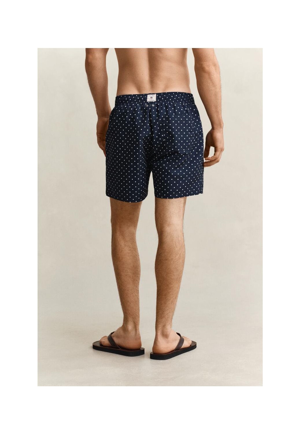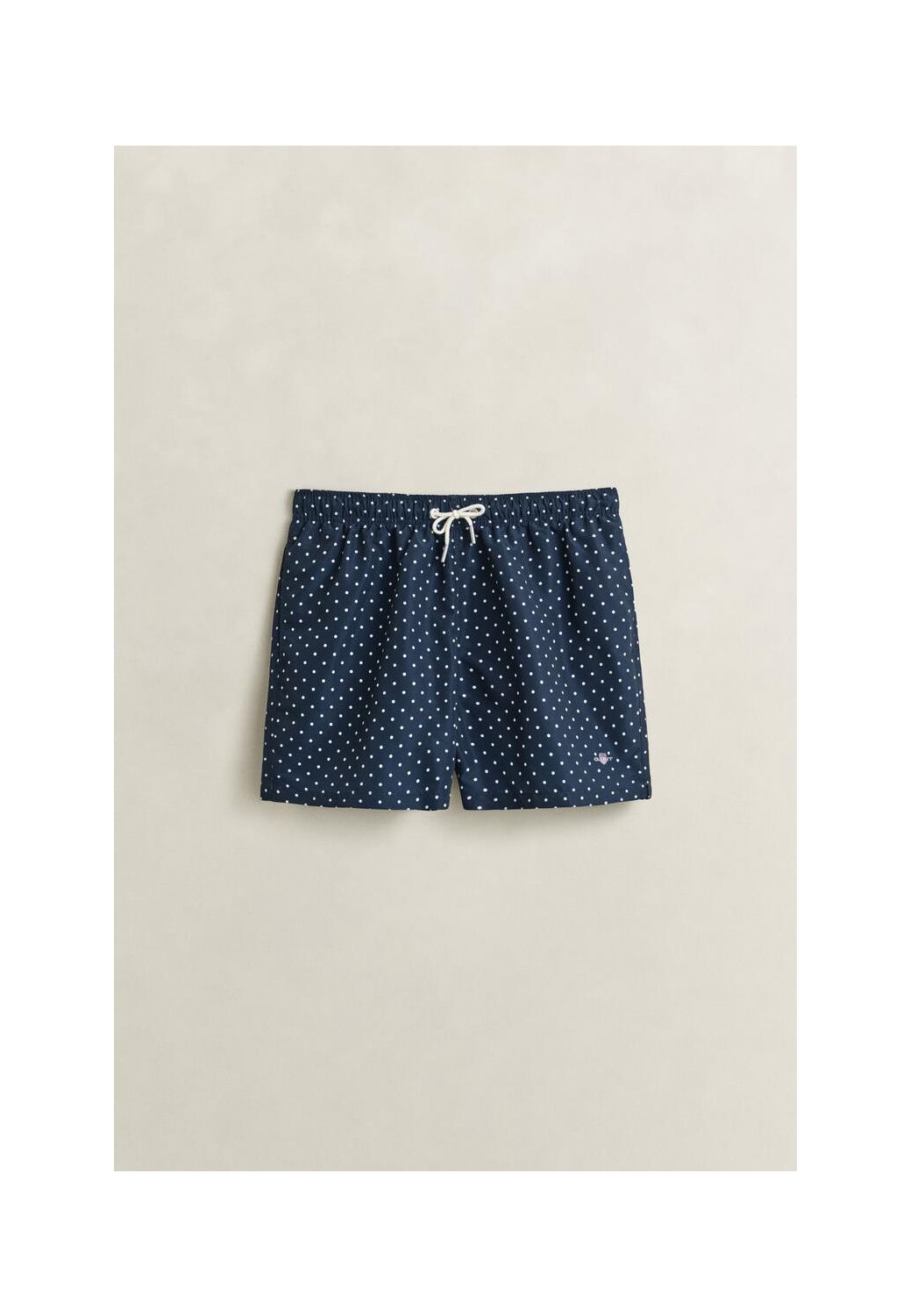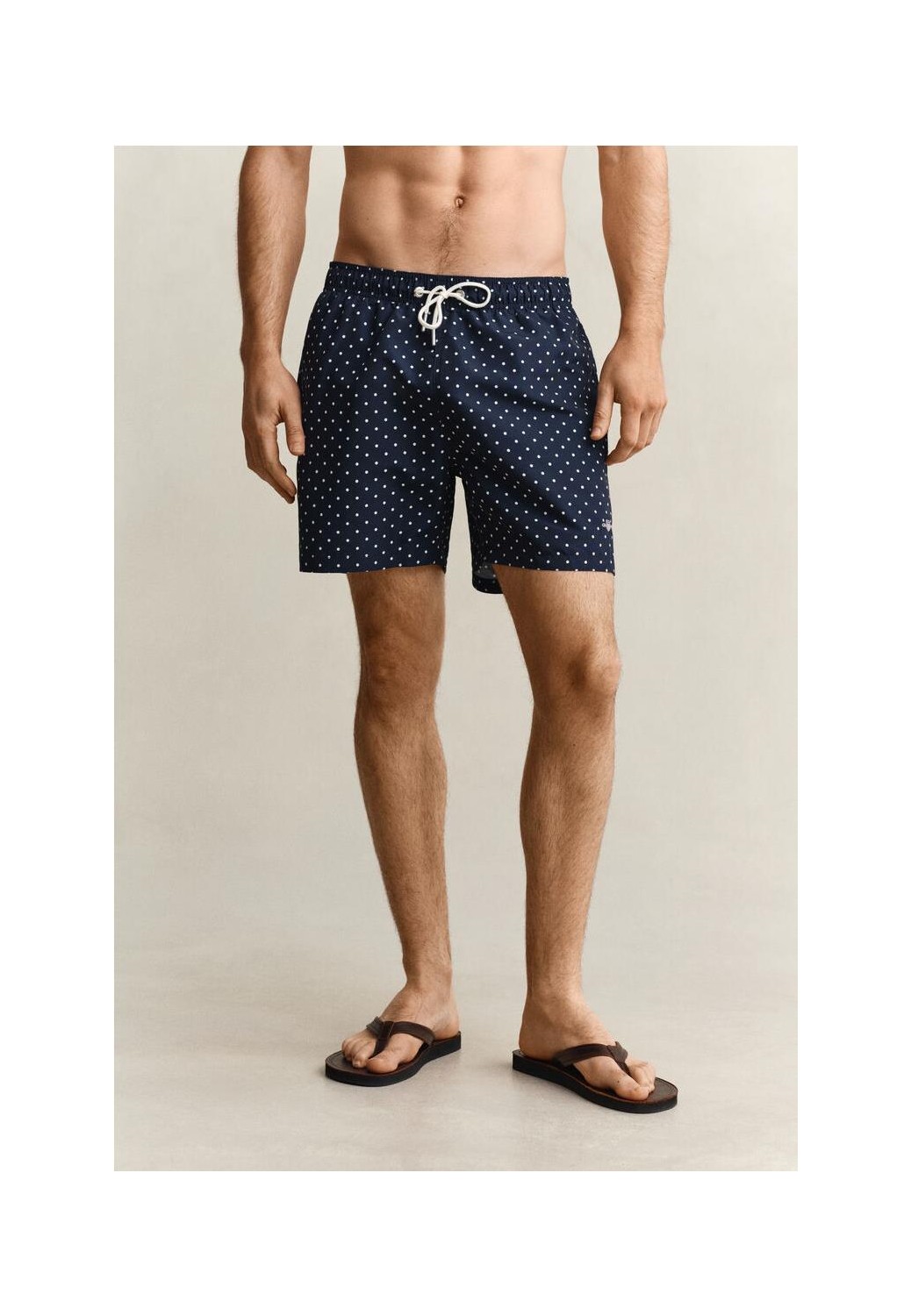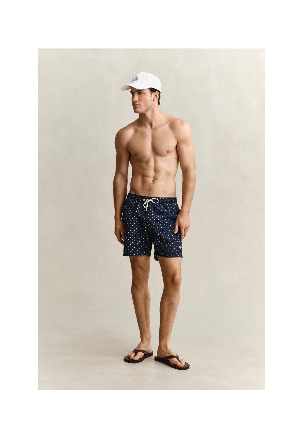 Este bañador está confeccionado en 100% poliéster reciclado con un estampado de lunares de temporada. Presenta corte normal, largo medio y talle normal con cinturilla elástica y cordón ajustable. Cuenta también con bolsillos en las costuras laterales, un único bolsillo trasero, nuestro logotipo bordado en la pernera izquierda y una etiqueta de tela en la parte posterior de la cinturilla.