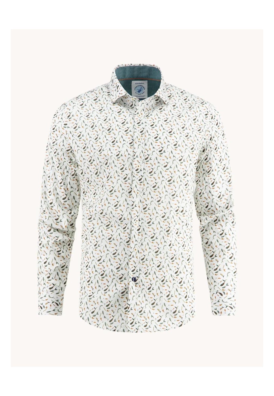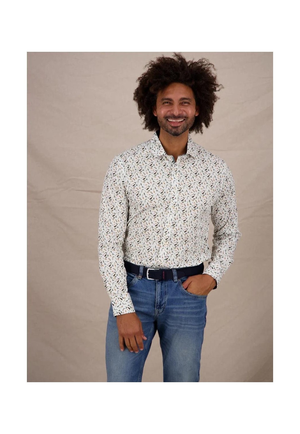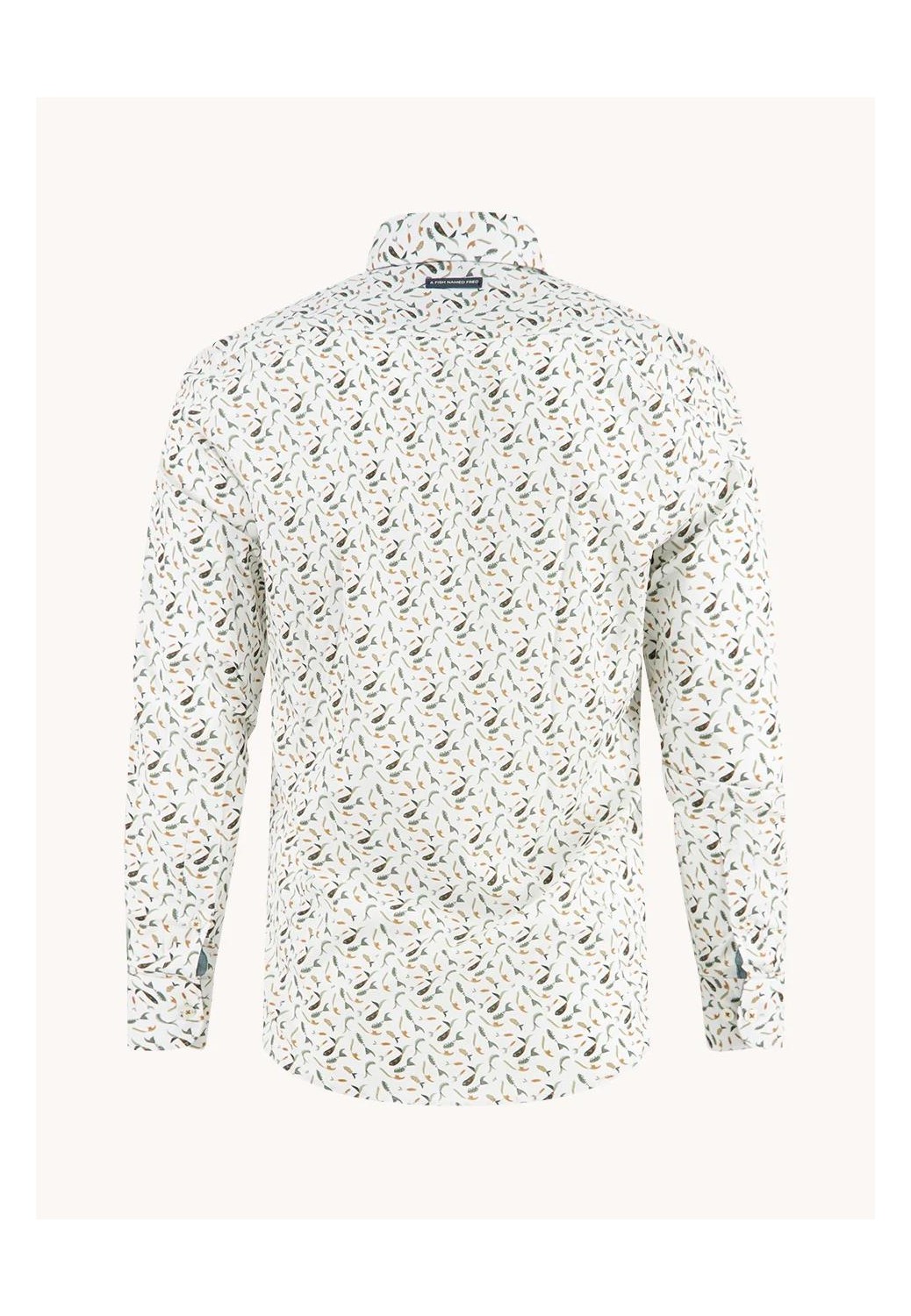 Camisa estampada de fondo blanco y estampados en verdes, beiges y marrones, vestibilidad entallada y con pinzas.