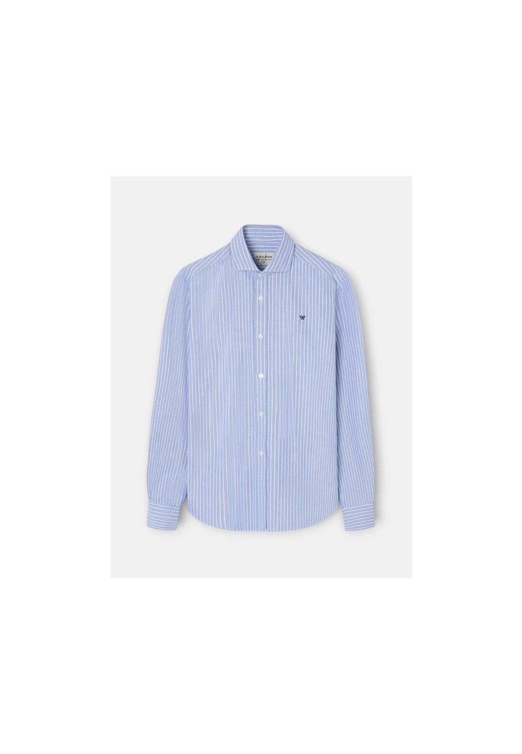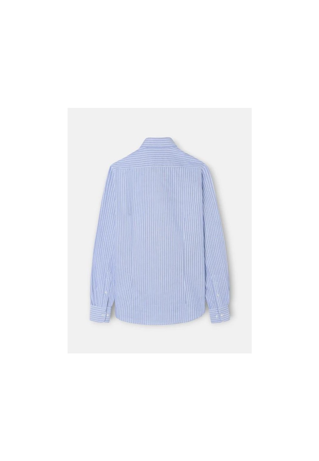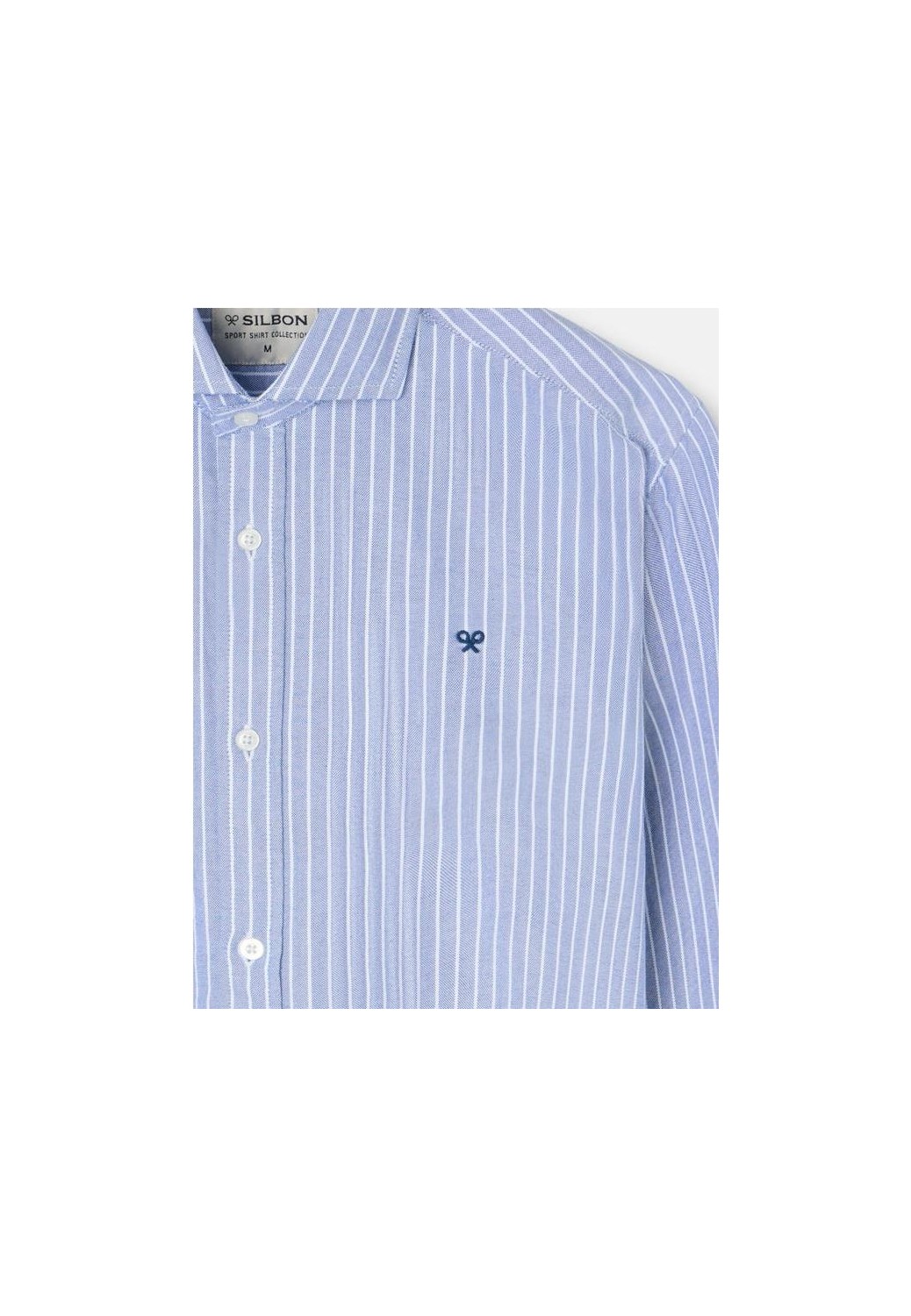 Camisa sport oxford con raya fina confeccionada en 100% algodón. Presenta cuello cutaway, cierre con botones personalizados y manga larga de puño con botones. Cuenta con raquetas bordadas en el torso.