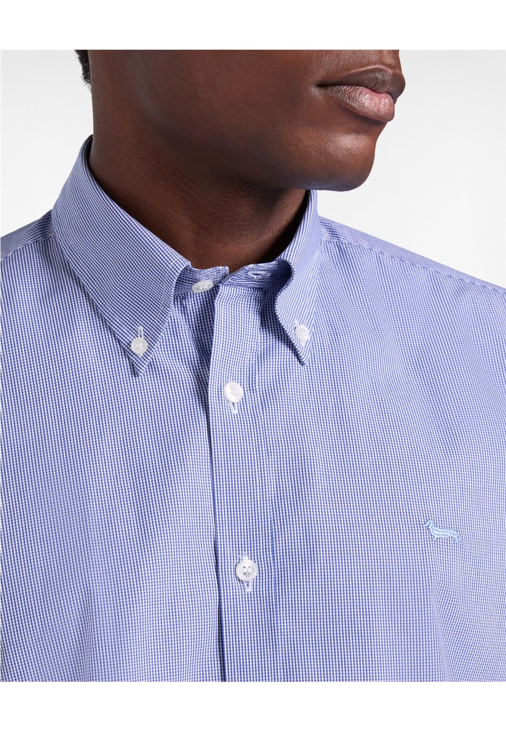 Camisa de algodón puro con estampado de microcuadros. Corte regular con detalles interiores en contraste que le dan un toque distintivo, ideal para quienes buscan un estilo sofisticado. Cuello abotonado y un perro salchicha bordado en el pecho izquierdo.