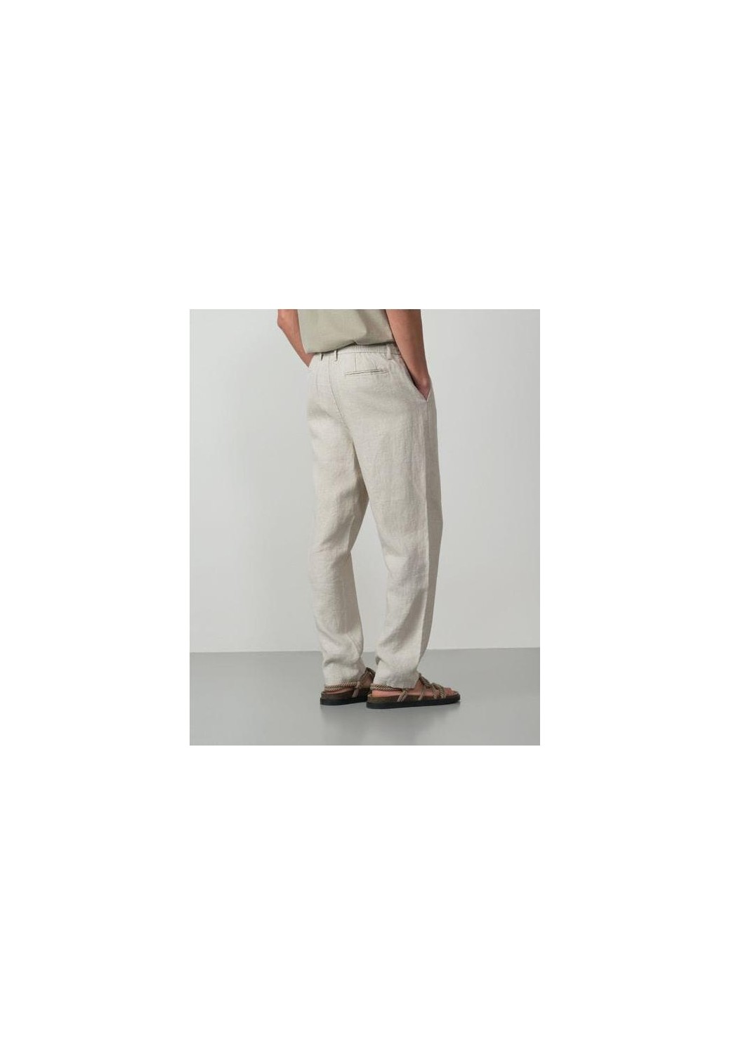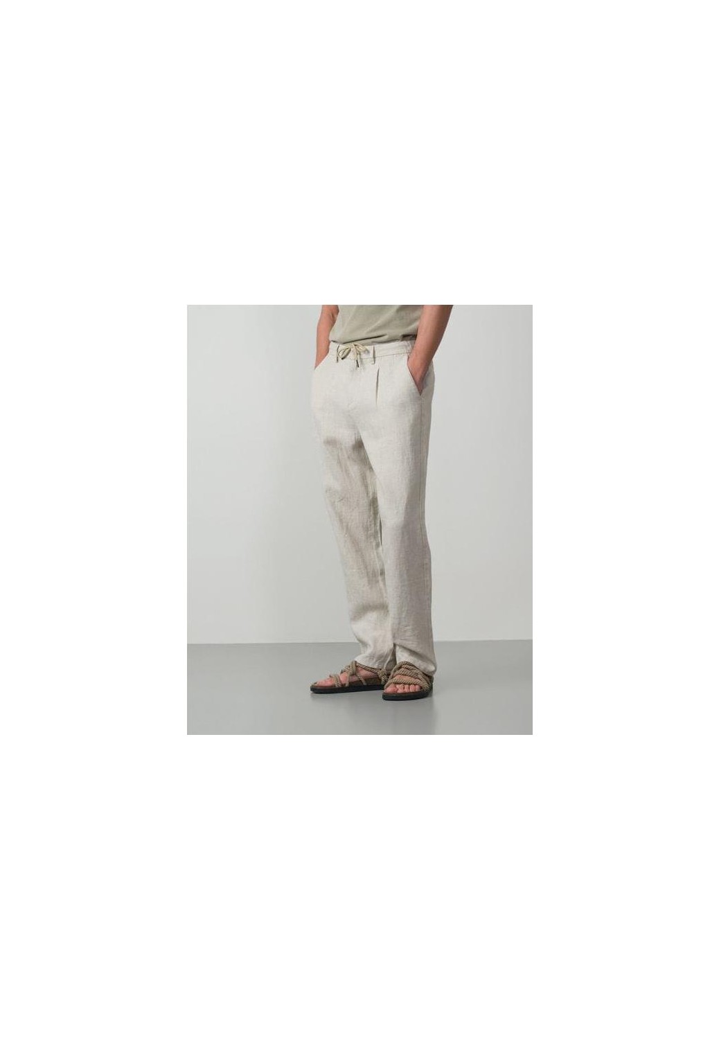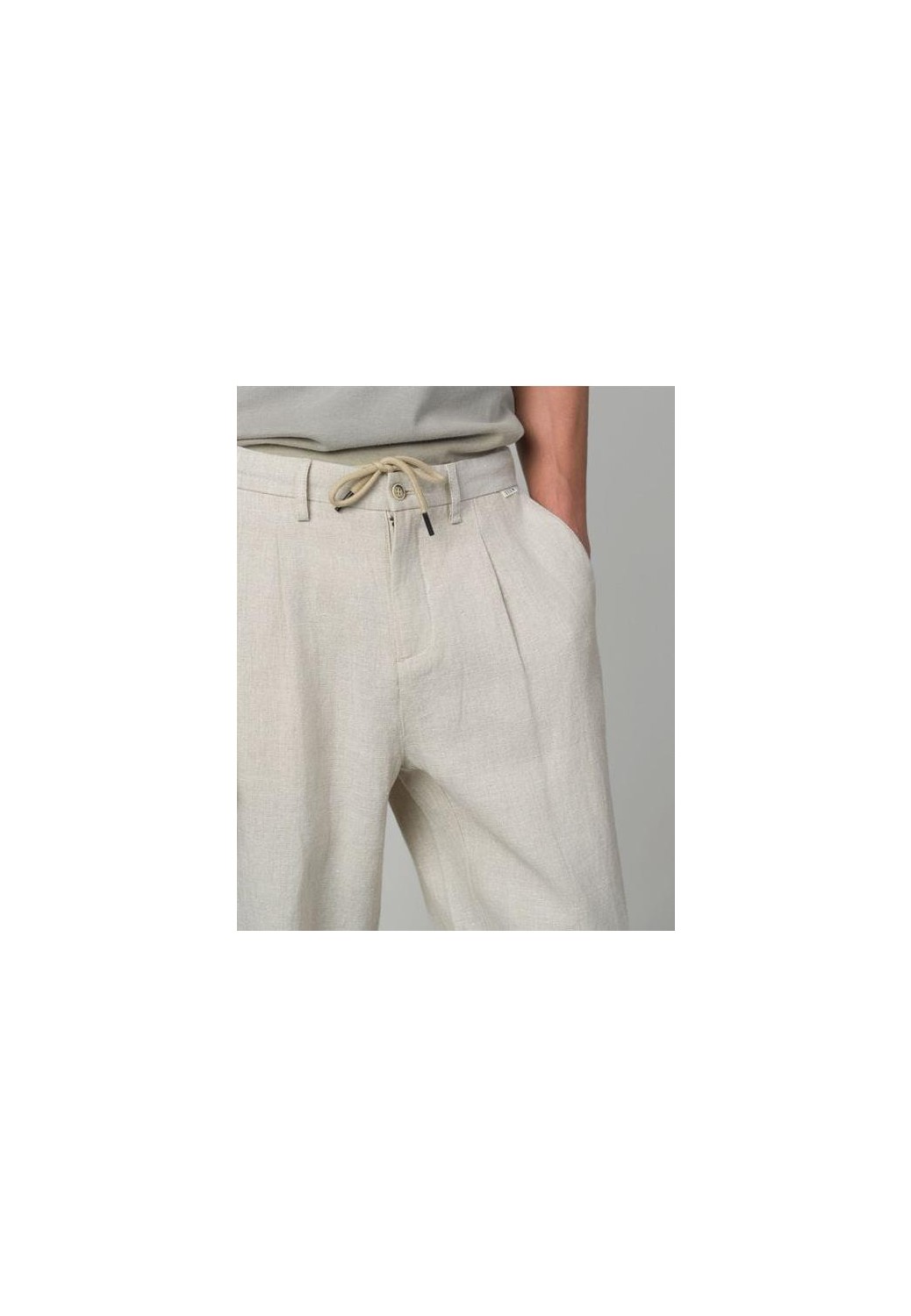 Pantalón sport chino de cordón y goma realizado en 100% lino. Con tiro bajo, una pinza, cierre de cremallera y botón, trabillas cintura y dos bolsillos traseros de vivo. Etiqueta exterior con logo Etiem. Línea relajada y confortable. Bajos de 20 cm de ancho para la talla 42. Ofrece un look smart-casual muy apropiado para un vestir informal y muy en tendencia.