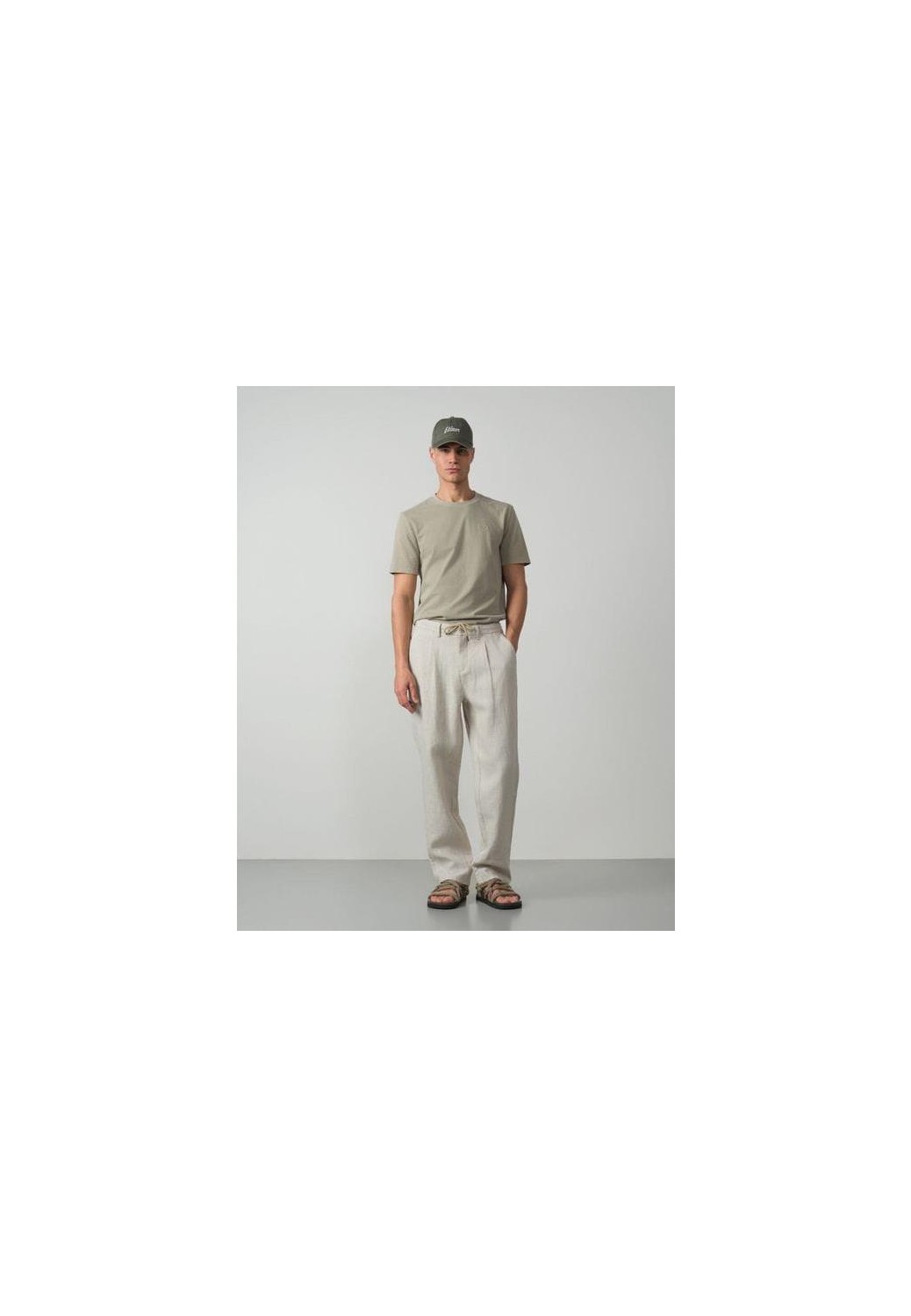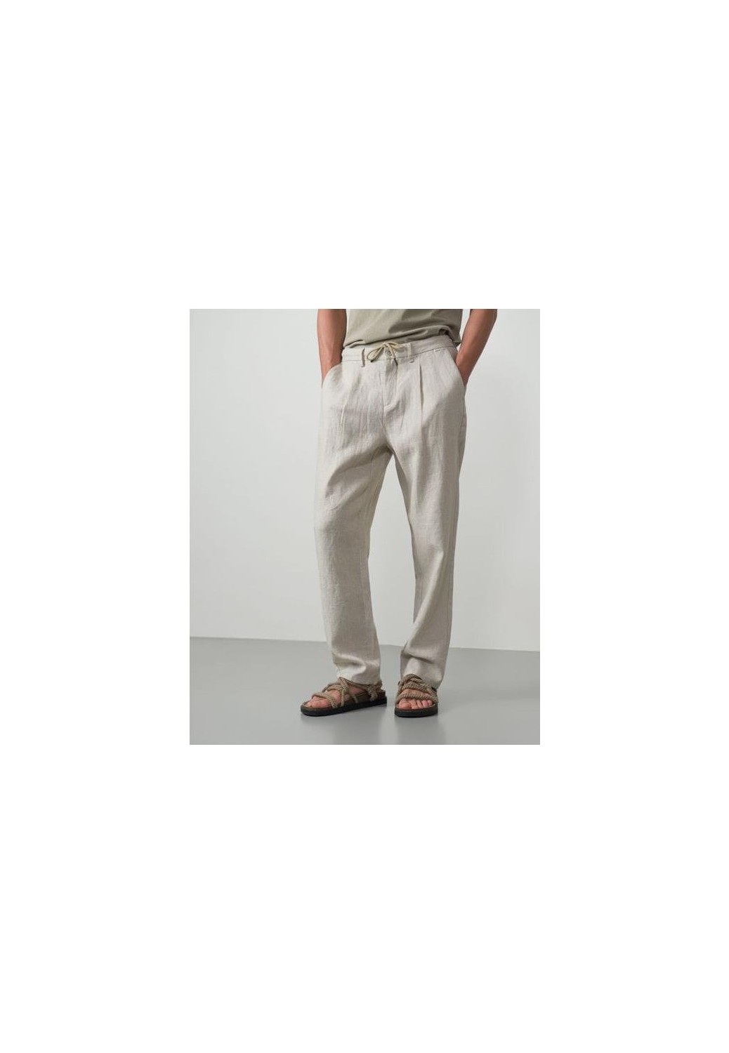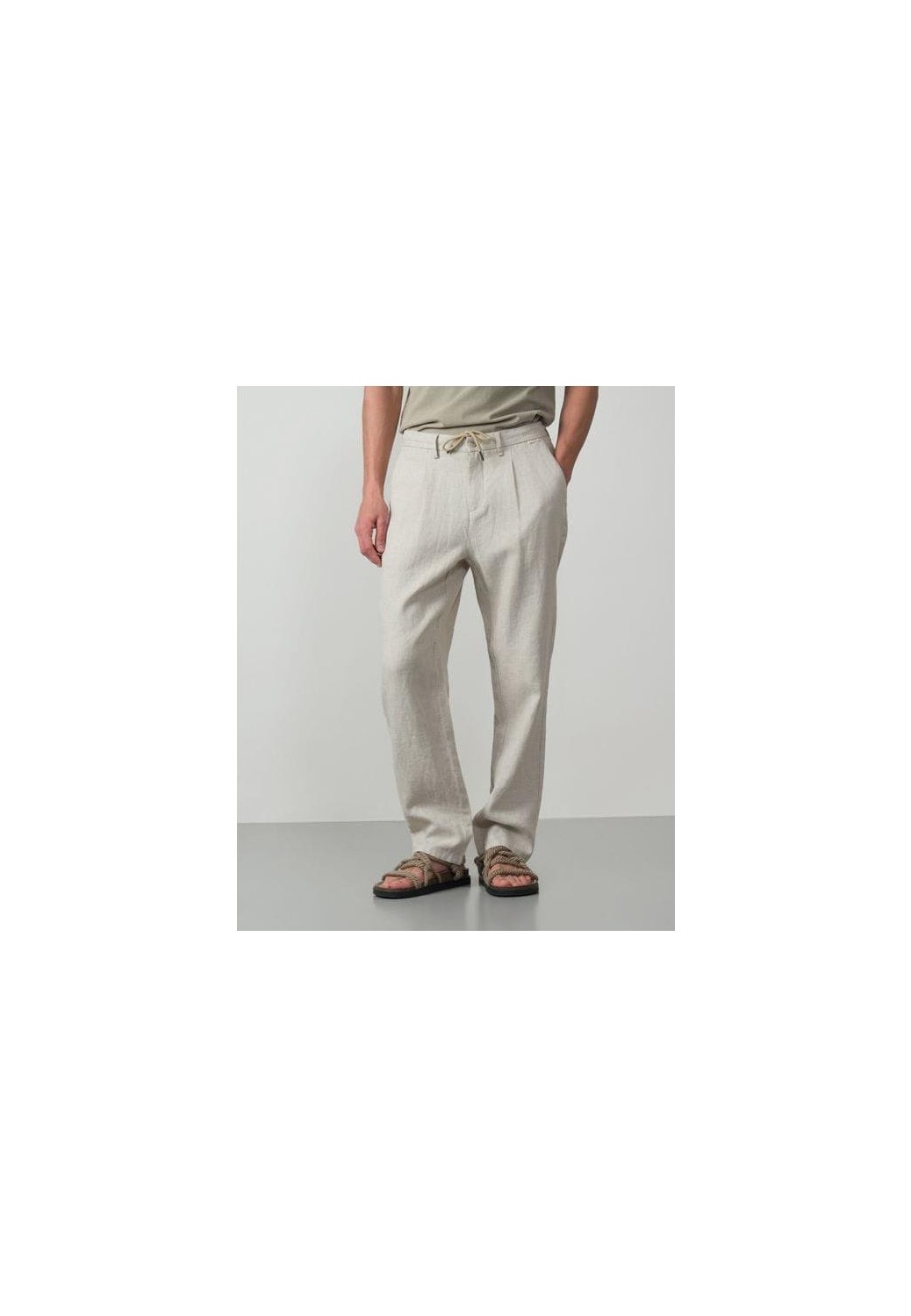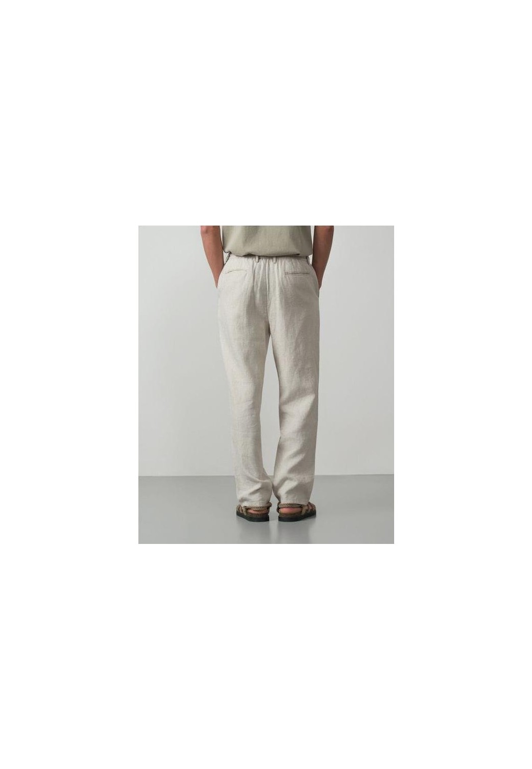 Pantalón sport chino de cordón y goma realizado en 100% lino. Con tiro bajo, una pinza, cierre de cremallera y botón, trabillas cintura y dos bolsillos traseros de vivo. Etiqueta exterior con logo Etiem. Línea relajada y confortable. Bajos de 20 cm de ancho para la talla 42. Ofrece un look smart-casual muy apropiado para un vestir informal y muy en tendencia.