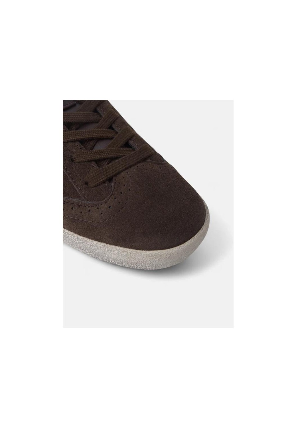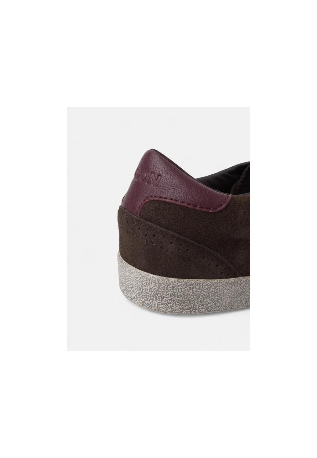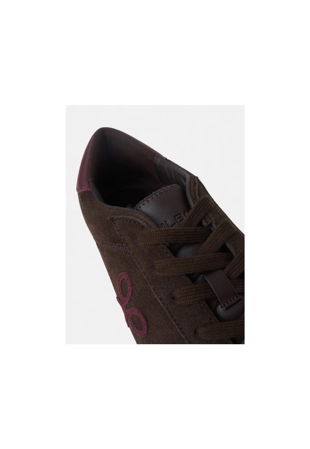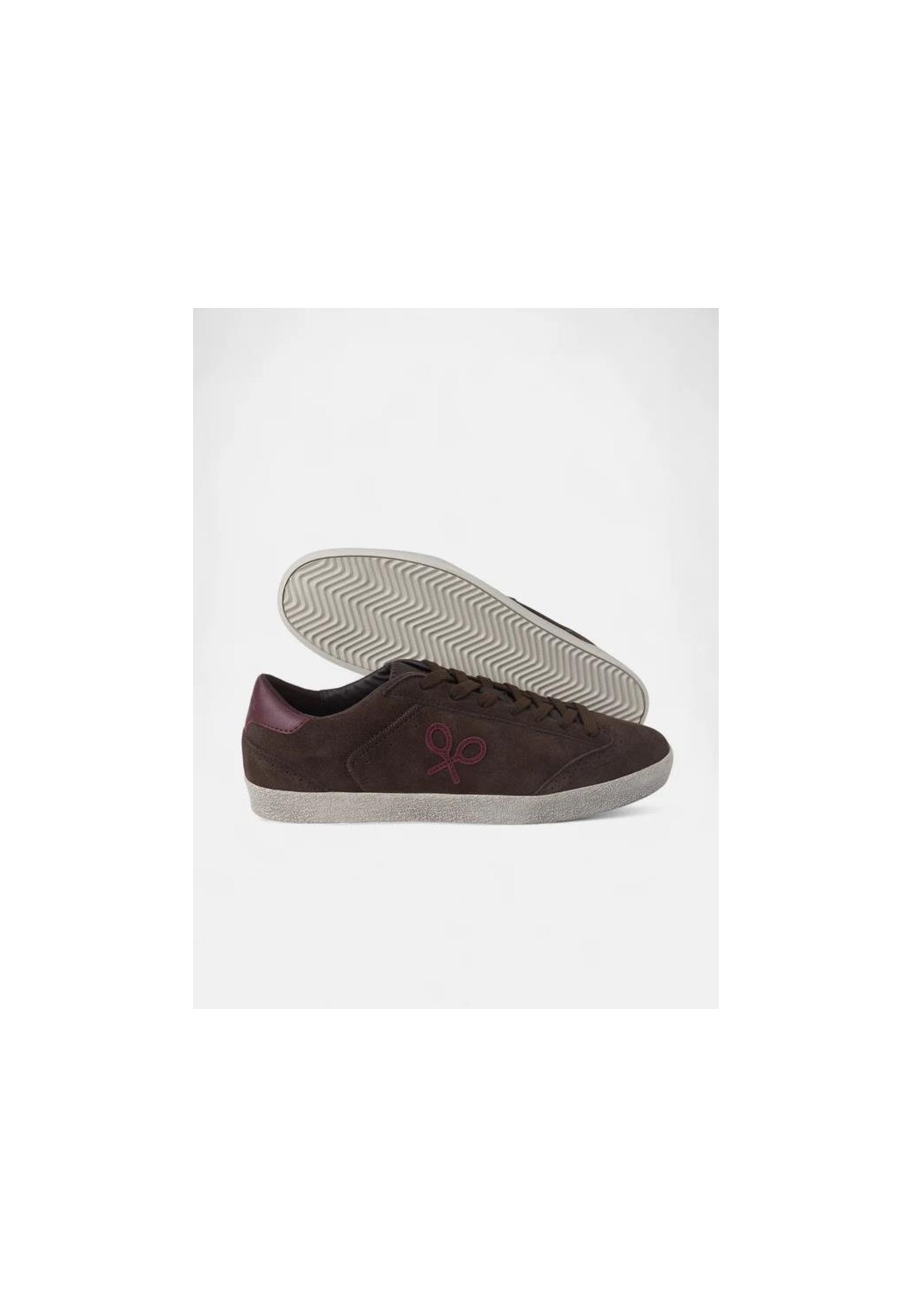 Zapatilla casual lisa marrón confeccionadas en piel serraje. Presenta aplique de piel de raqueta lateral, cierre con cordones y lengüeta con detalle de letras Silbon. Cuenta con suela de goma confortable, interior en piel suave, y letras grabadas en la parte trasera.