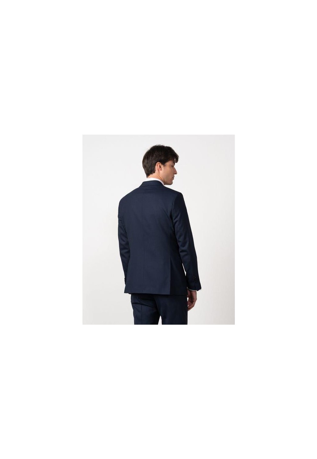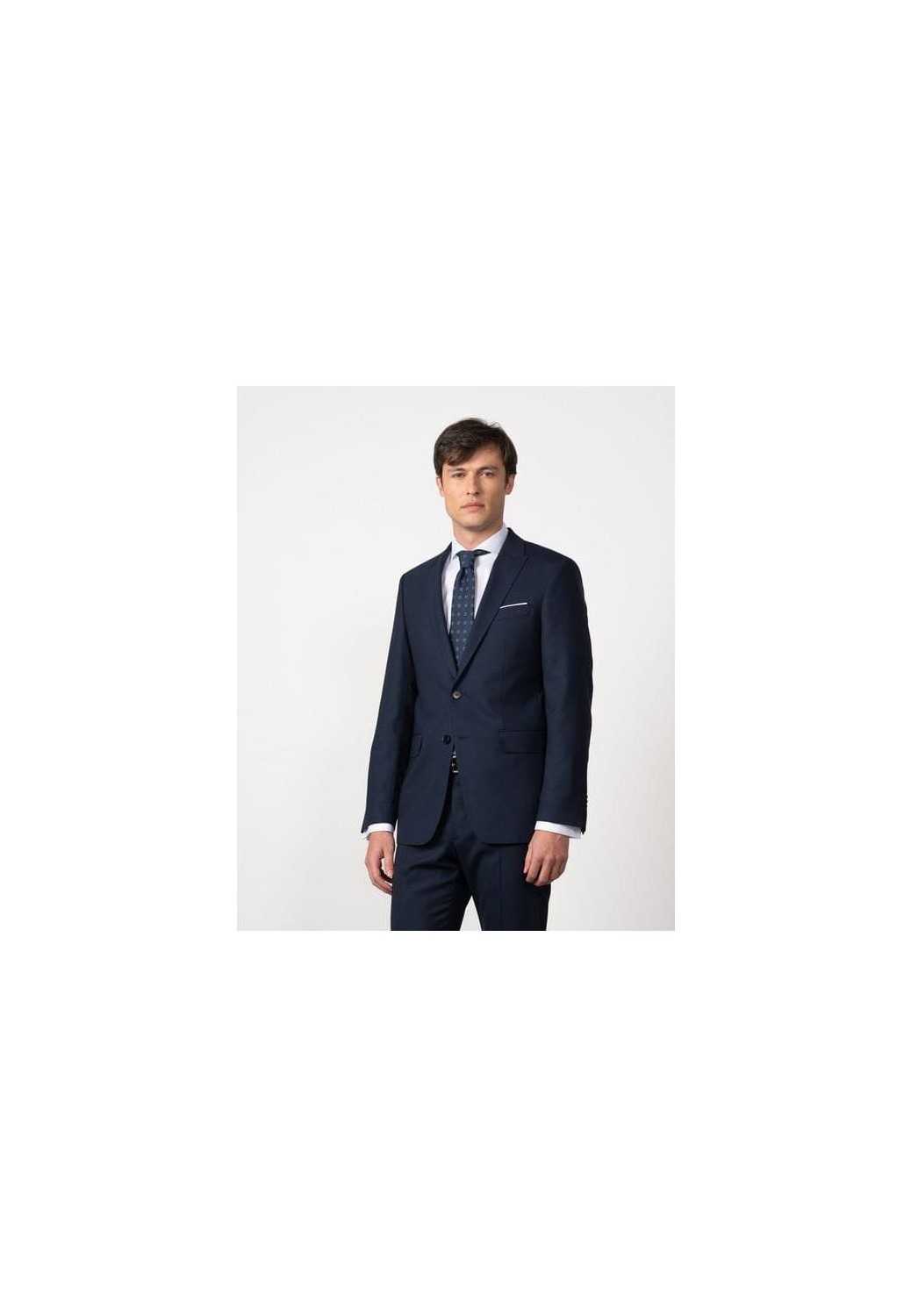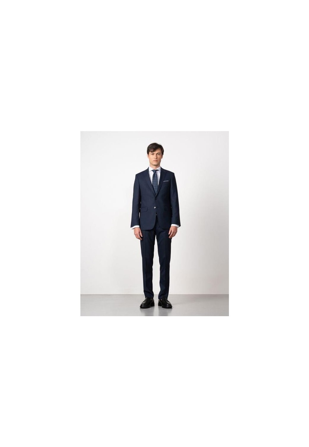 Traje slim fit realizado en una microestructura bicolor elástica de lana mezcla. El elastán proporciona a la prenda confort y libertad de movimientos. La chaqueta presenta cierre de dos botones, picadillo, dos aberturas en la espalda y punté en solapa pico y carteras bolsillos. Tiene una largo de 73 cm para la talla 50. Forro entero de fantasía con tres bolsillos. El pantalón es de tiro bajo con cierre de cremallera y botón, dos bolsillos traseros de ojal y sin pinza.