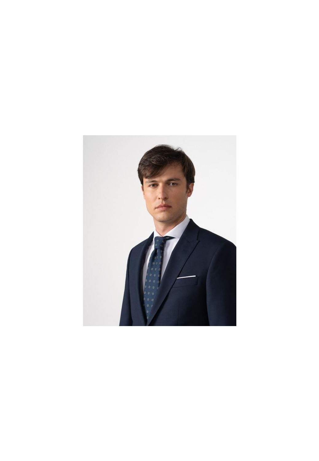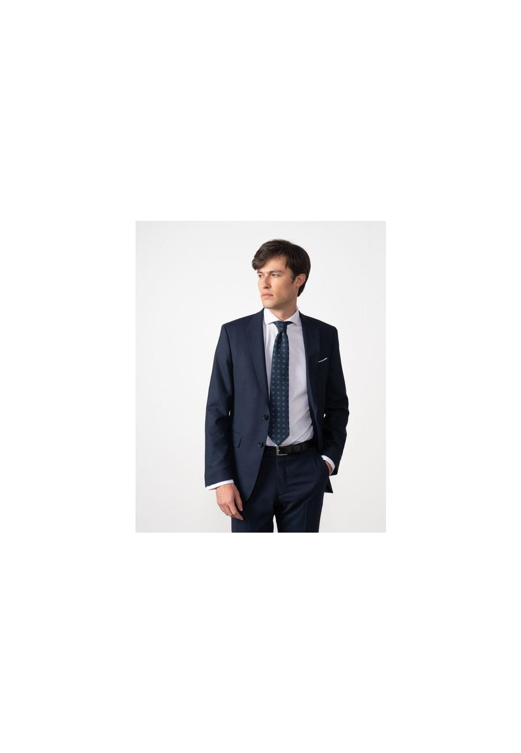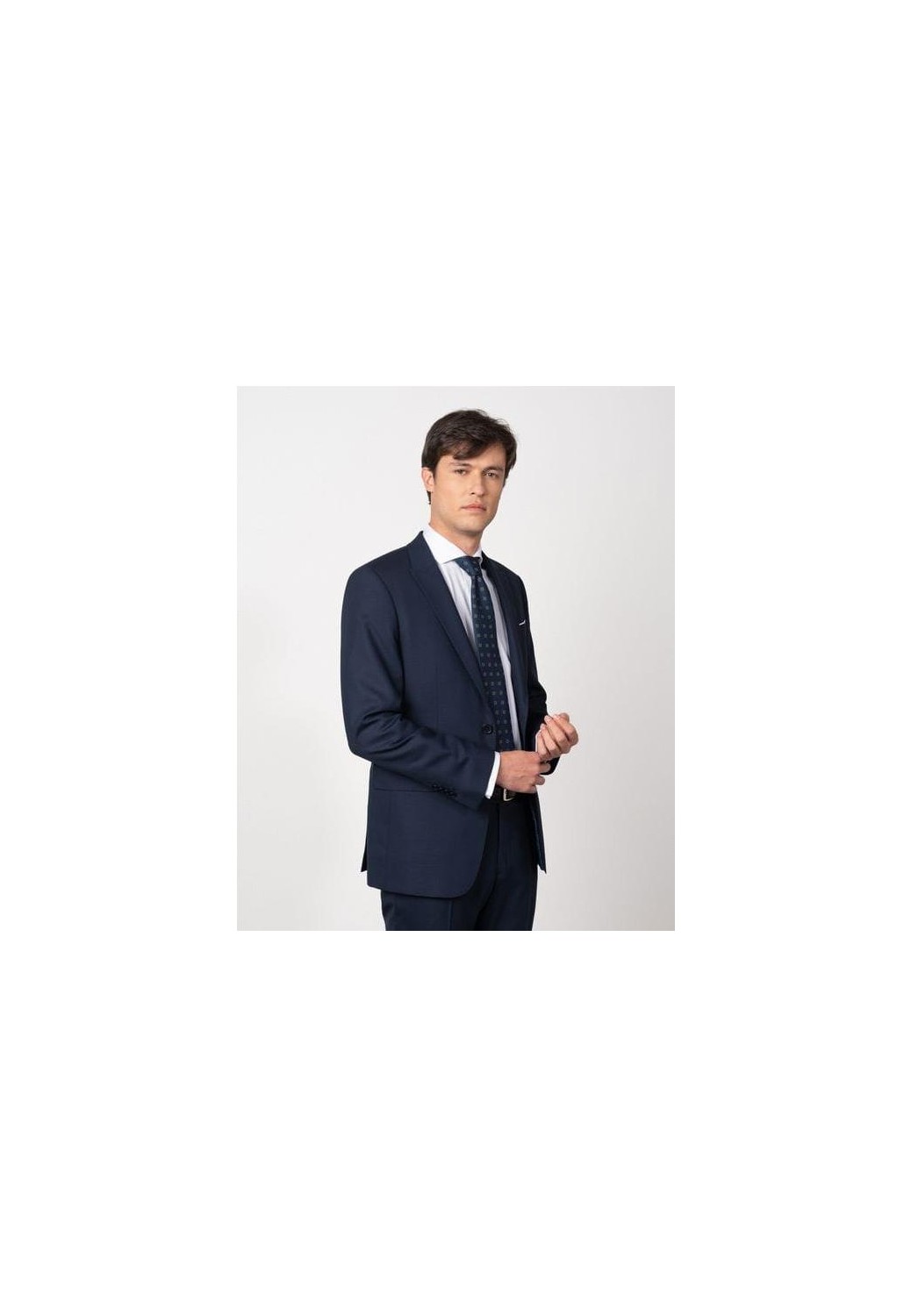 Traje slim fit realizado en una microestructura bicolor elástica de lana mezcla. El elastán proporciona a la prenda confort y libertad de movimientos. La chaqueta presenta cierre de dos botones, picadillo, dos aberturas en la espalda y punté en solapa pico y carteras bolsillos. Tiene una largo de 73 cm para la talla 50. Forro entero de fantasía con tres bolsillos. El pantalón es de tiro bajo con cierre de cremallera y botón, dos bolsillos traseros de ojal y sin pinza.